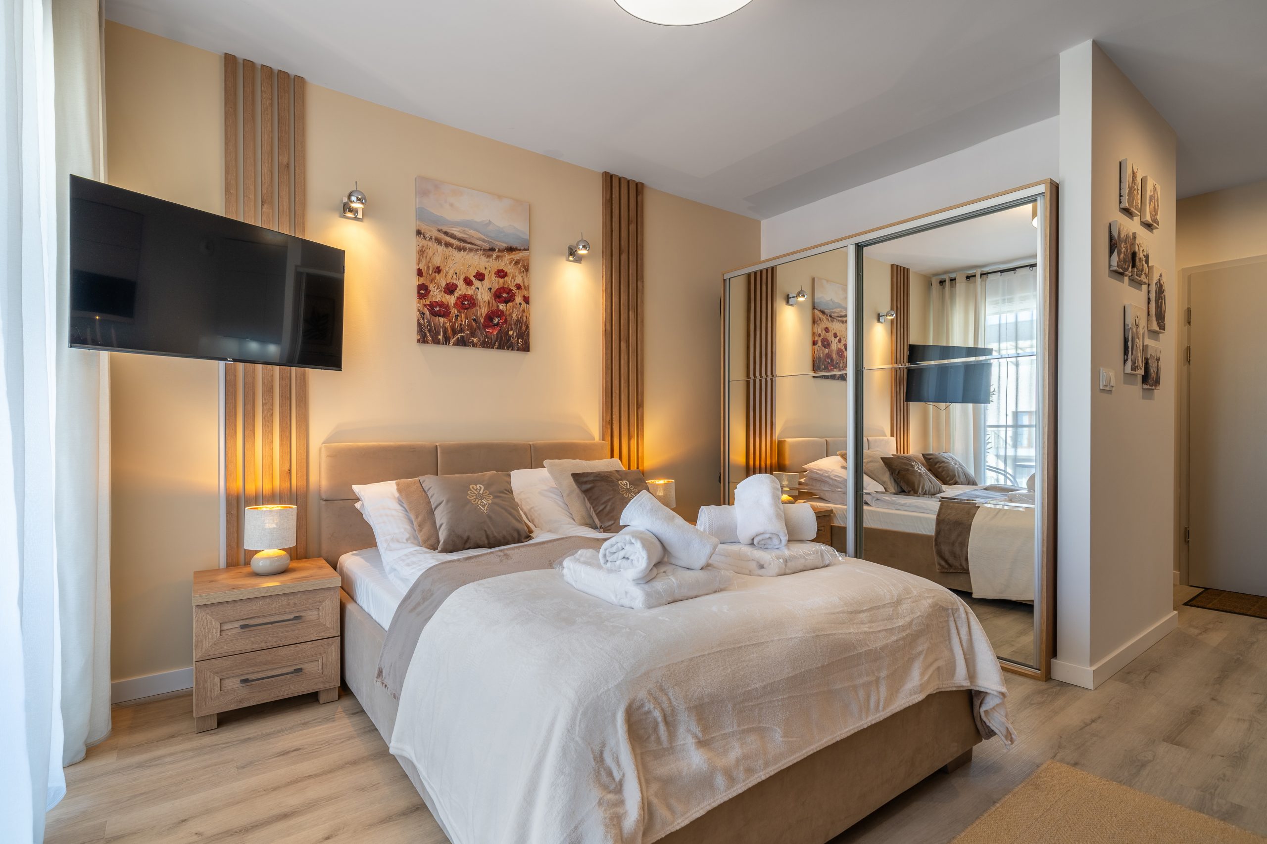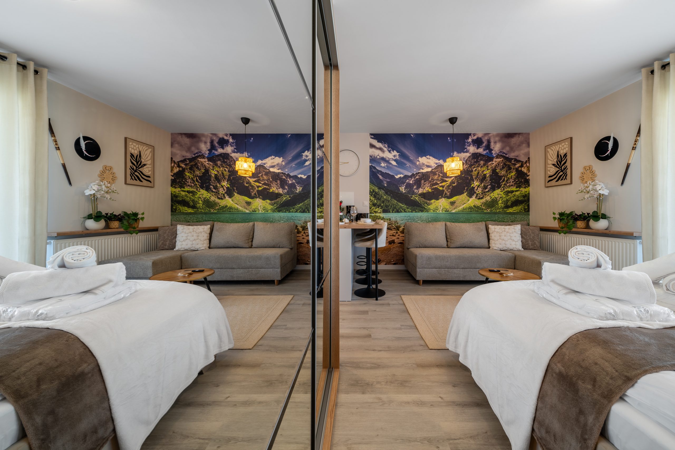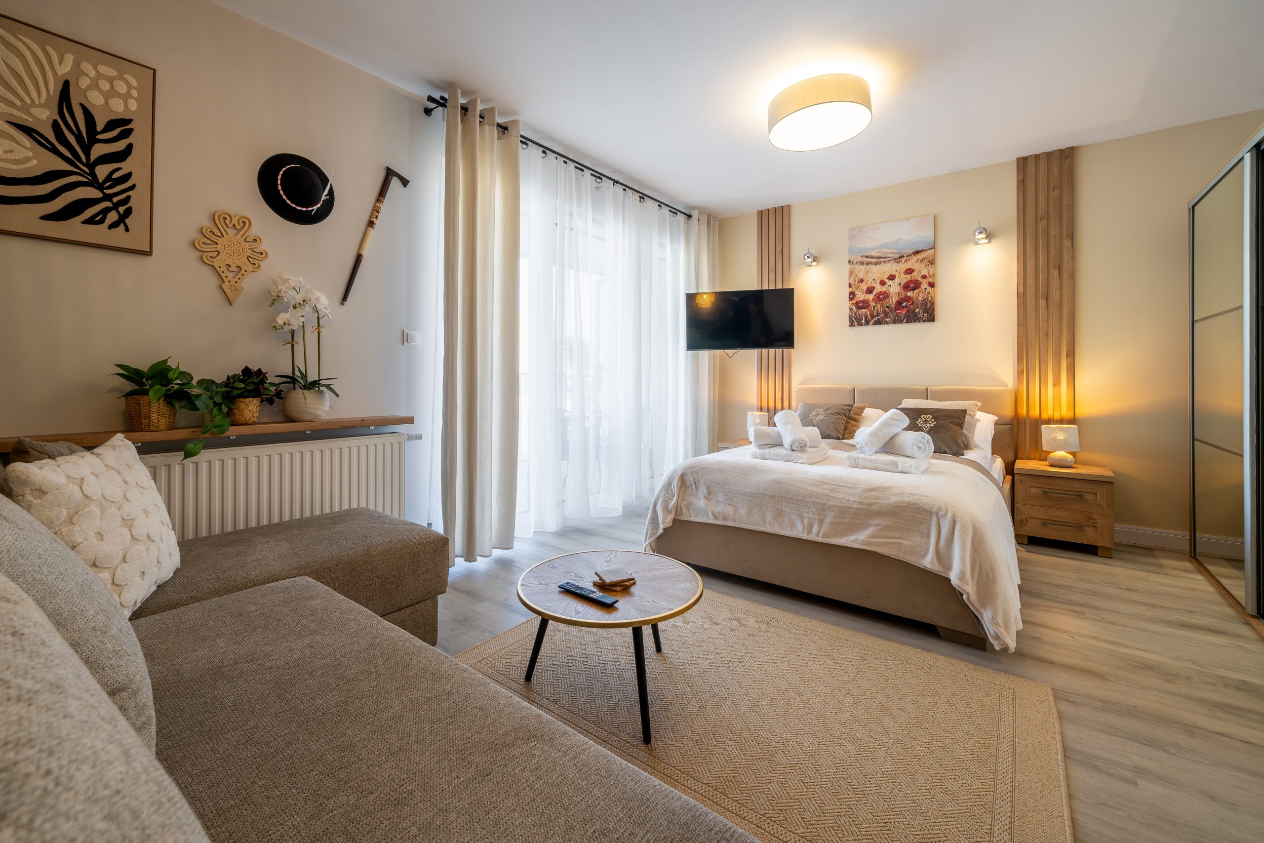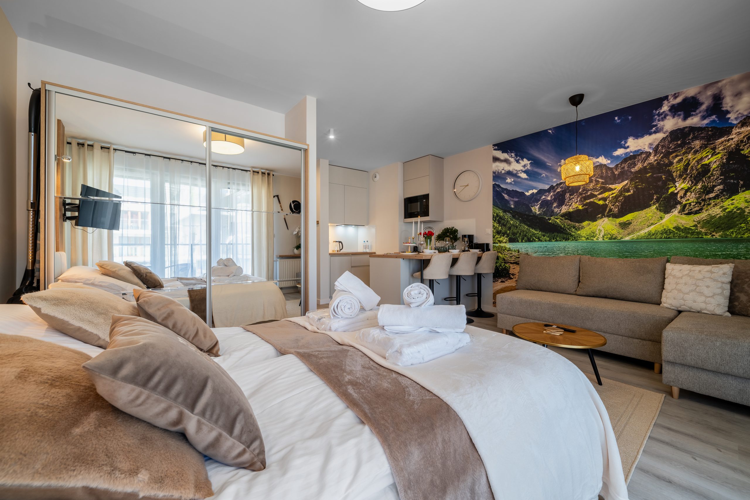 Salon z aneksem kuchennym, gdzie zmieściło się podwójne łóżko z wielka szafą, stolikami nocnymi.