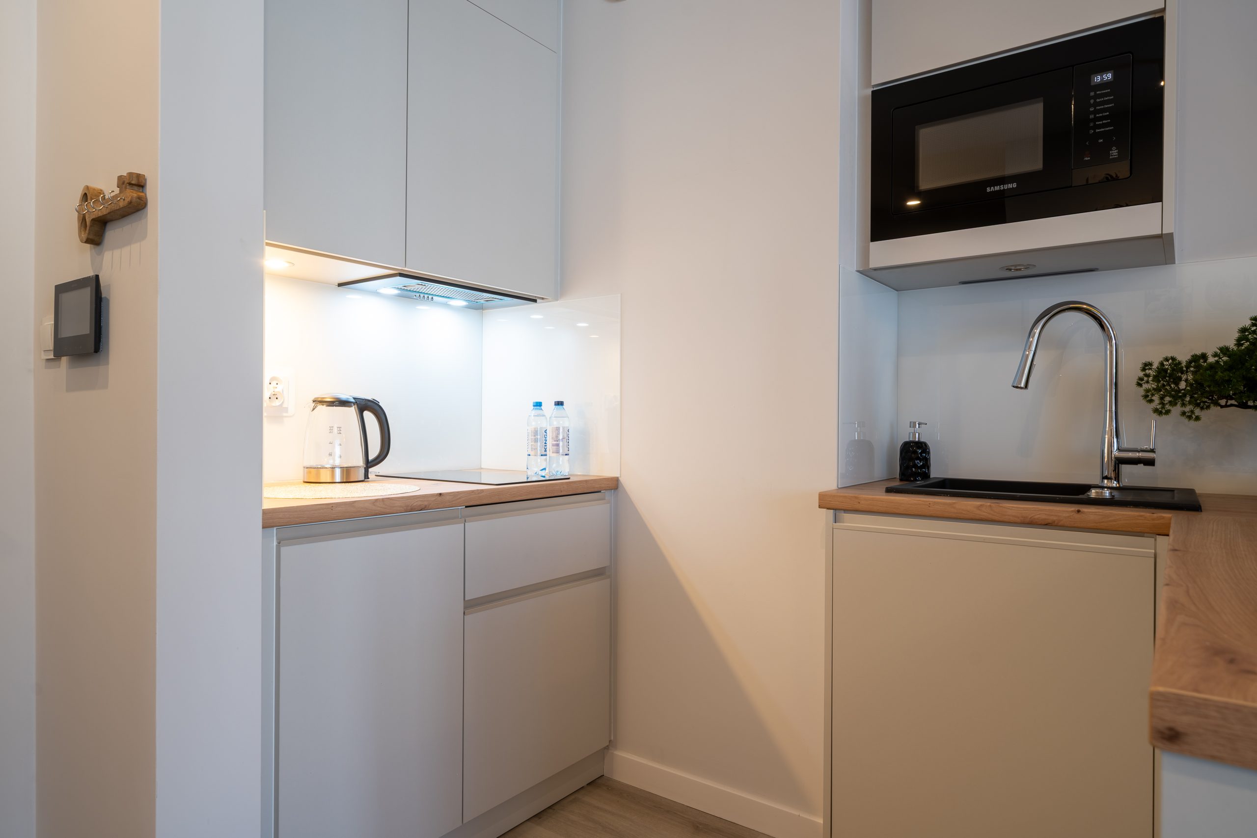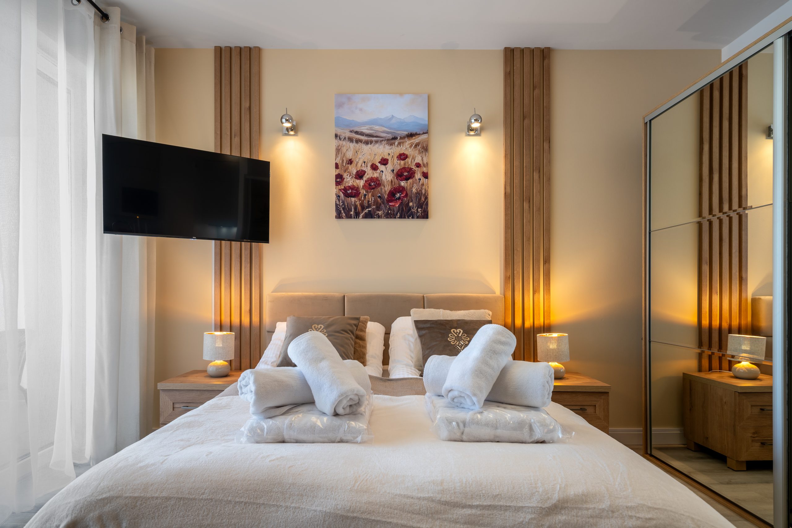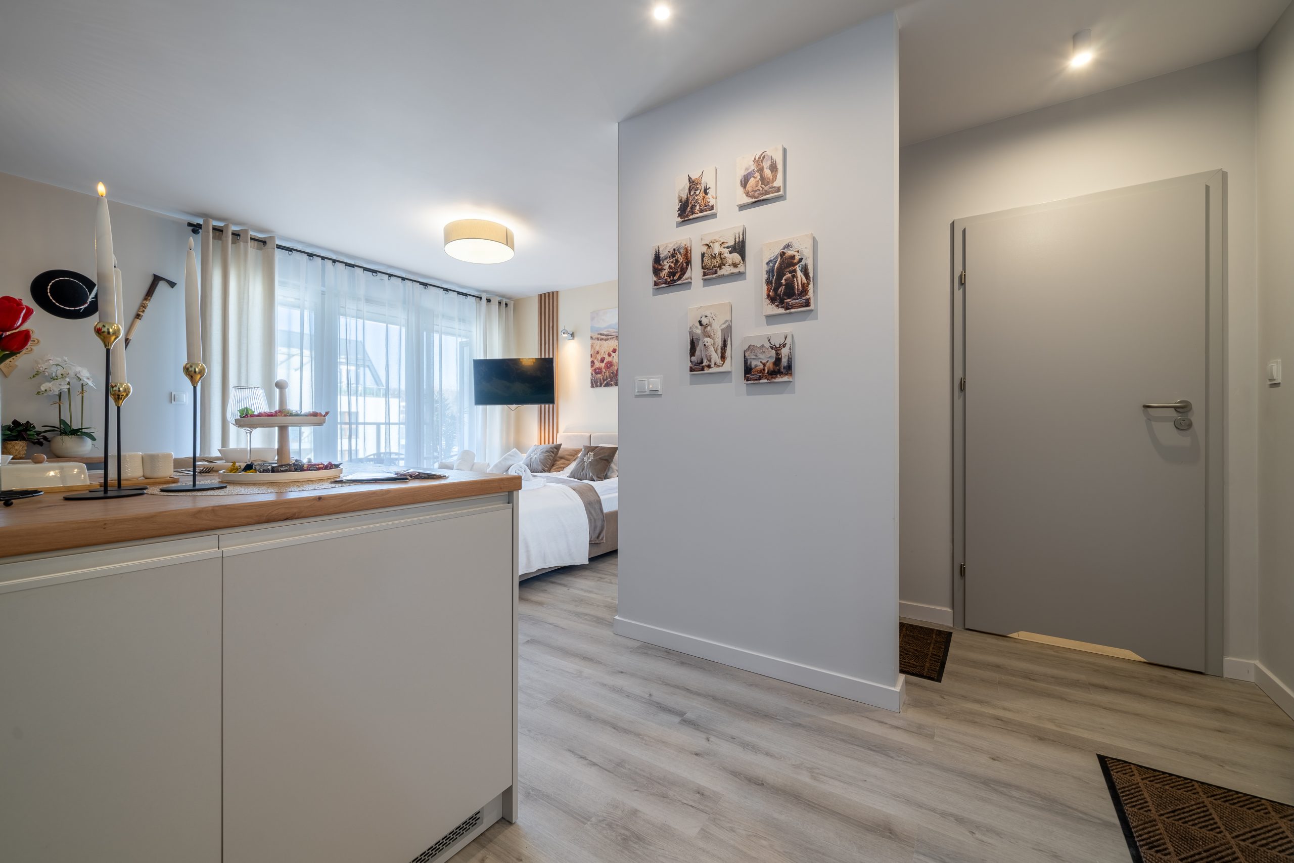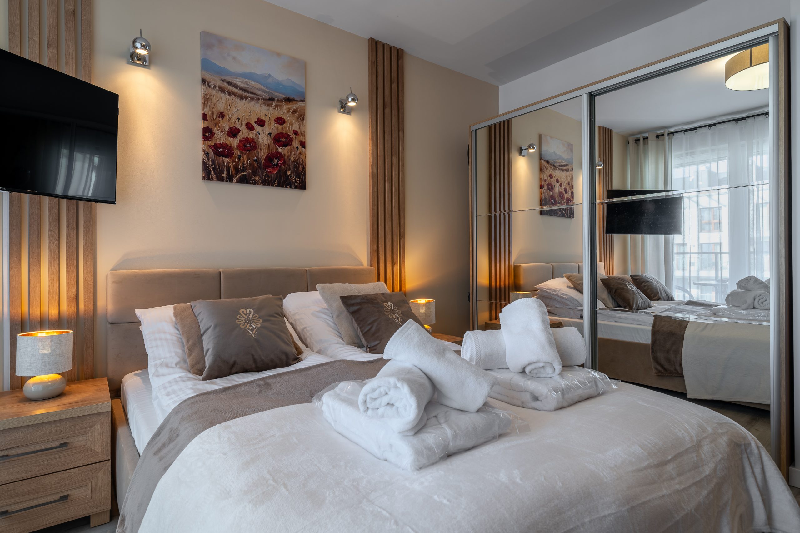 Salon z aneksem kuchennym, gdzie zmieściło się podwójne łóżko z wielka szafą, stolikami nocnymi.