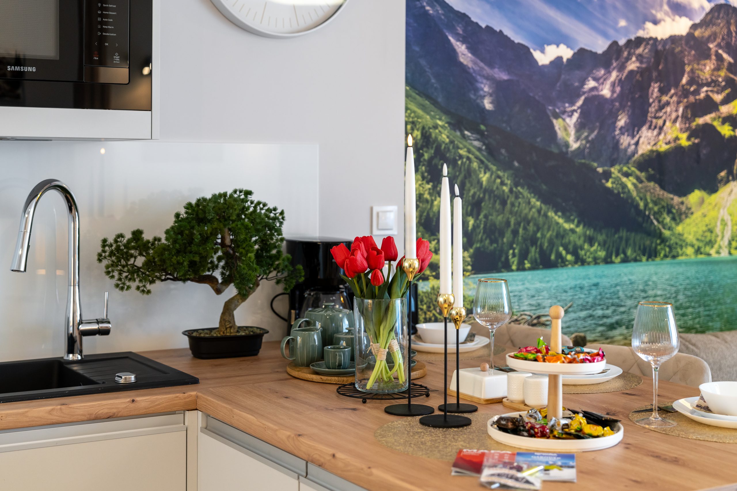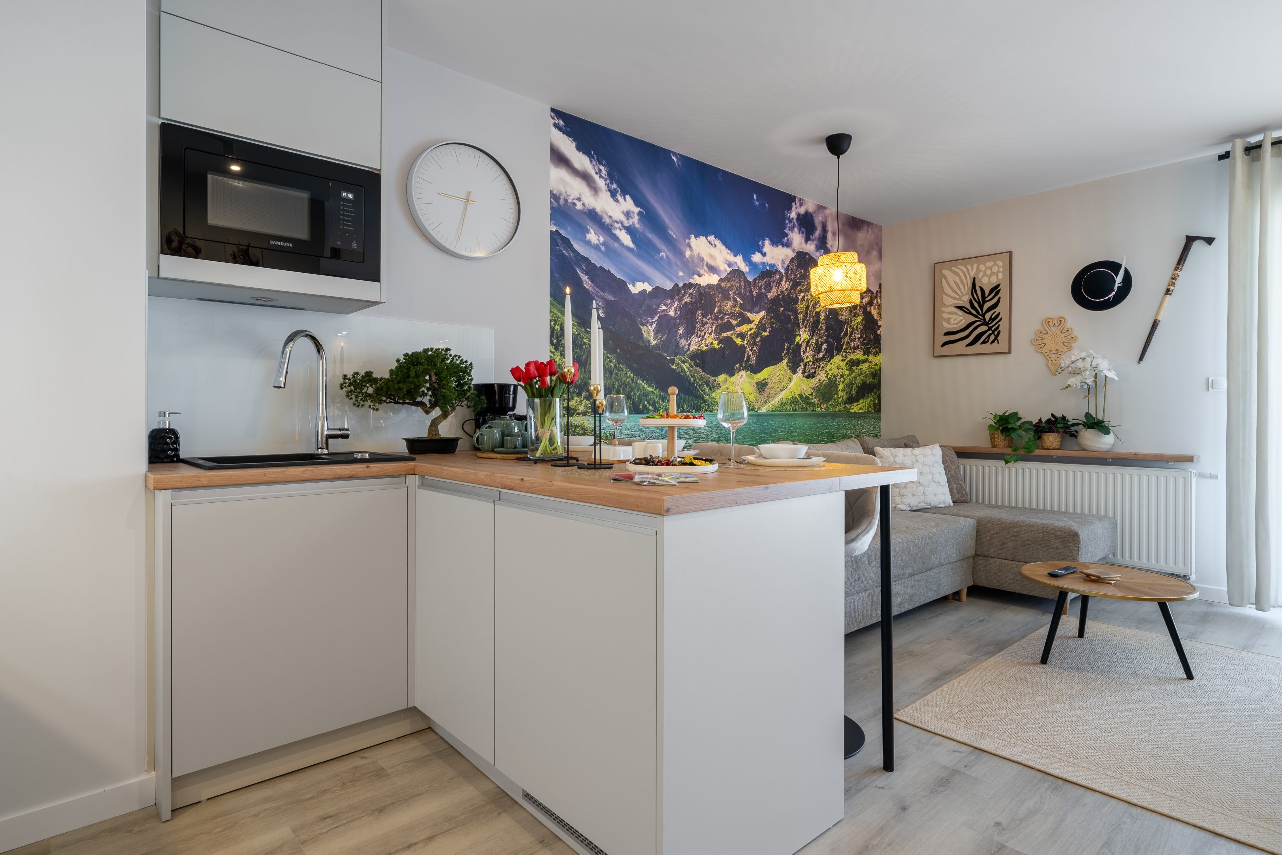 Salon to rozkładana sofa z telewizorem, w pełni wyposażony aneks kuchenny i blat jadalniany z  3 krzesłami.